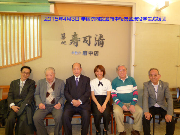 左から、久保田正就(アメフトOB、昭41経)、千住貞夫(硬式野球部捕手OB、昭31政経)、野口忠直(前府中市長、昭33政経)、長瀬さん(心理学科在学中)、伊地知 寛(アメフトOB、昭33政経)、善利秀臣(八王子桜友会長、昭48経)