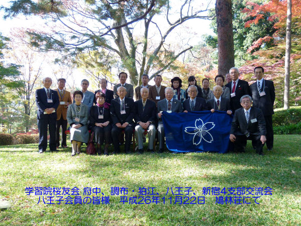 学習院桜友会 府中、調布・狛江、八王子、新宿4支部交流会平成28年11月5日、山荘(府中市)にて開催しました。小春日和の中、内藤政武院長ご夫妻をはじめ総勢71名が参加され、楽しい園遊会でした。
