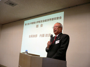 総会では、内藤政武経済学部同窓会会長の開会挨拶に始まり、決算報告、監査報告、予算案と役員改選案が承認されました。尚26年4月1日より西園寺裕夫氏(昭和46年卒)が会長となることが承認されました。