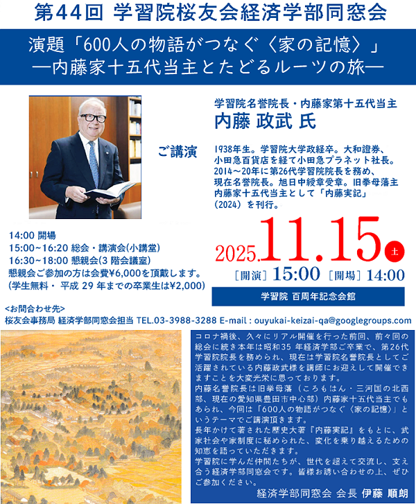 本年は、学習院名誉院長としてご活躍されていらっしゃいます内藤政武様をお迎えし、昨年刊行されました著書「内藤実記」についてのご講演いただくこととなりました。