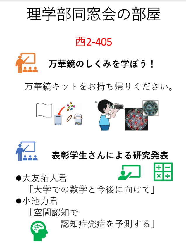 お子様、お孫様に楽しんでいただける「万華鏡のしくみを学ぼう」(万華鏡のお土産付)と理学部同窓会賞受賞者の発表が行われます。