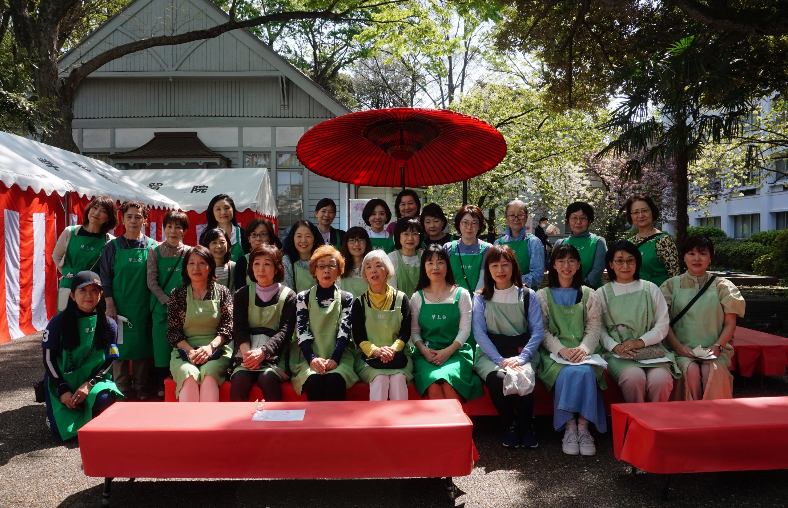 快晴に恵まれ名残の桜が舞う4月14日(日)、目白キャンパスにてオール学習院の集いが開かれ、草上会は、例年ご来場の皆さまに親しんでいただいている花見茶屋・ヨーヨー釣り2つの催しで参加いたしました。