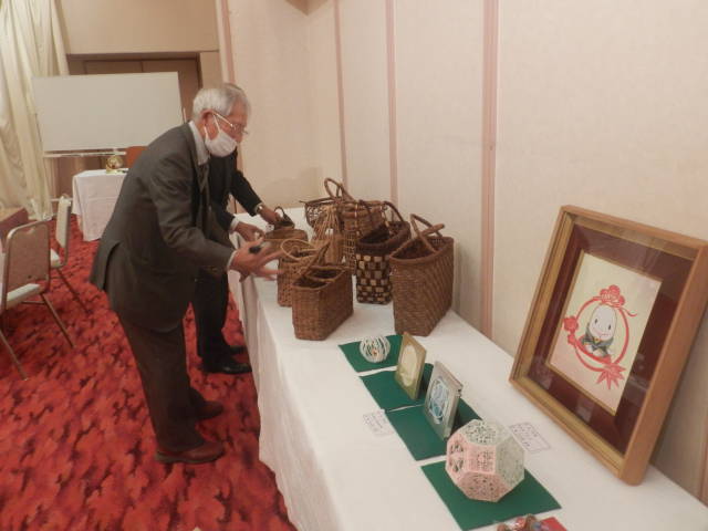 ・出展者の方から丹精込めた作品の説明がありました。(立体切絵、ブドウ蔓の編籠、油絵など)