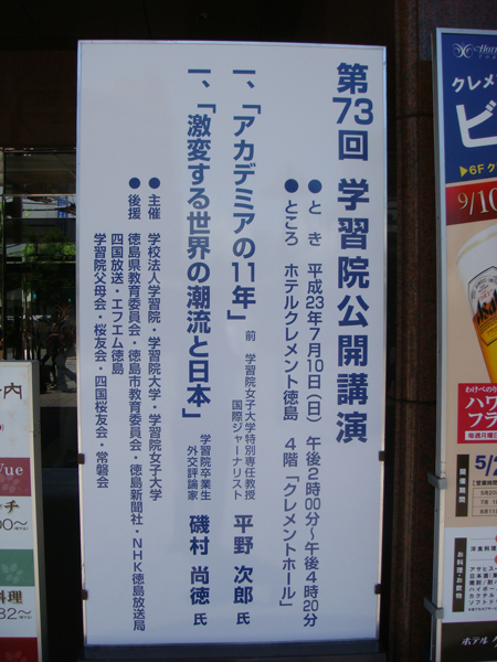 学習院公開講演が、徳島市のホテルクレメント徳島にて開催され、会場満員の500人の参加がありました。開会にあたり波多野学習院長よりご挨拶。引き続き、平野次郎氏の講演「アカデミアの11年」、磯村尚徳氏の講演「激変する世界の潮流と日本」があり、お二人の、NHK時代のお話や諸外国のVIPに対する取材のお話など、興味深いお話をお聞きすることができました。学習院広報課のブログにも掲載されてます。